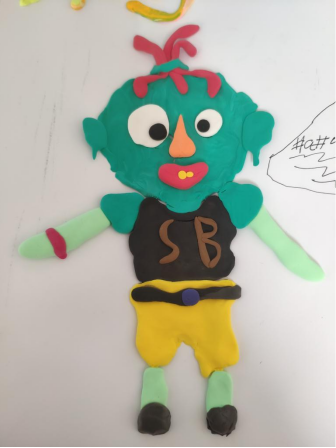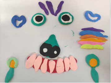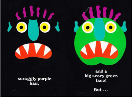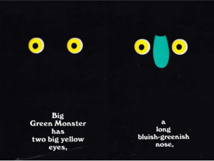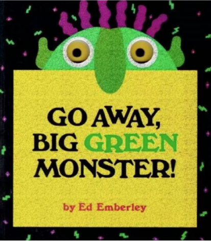 书中有一只 big green monster (绿色的大怪兽),他有着两只黄色的大眼睛,一个长长的蓝绿色鼻子,两只弯曲的小耳朵,还有一个大大的红色嘴巴,里面长着锋利的白色牙齿……虽然他看上去有点可怕,但是,当你勇敢地对他说:Go away!(走开!)会发生什么事情呢…