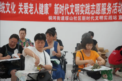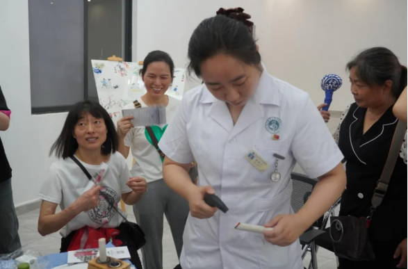 此外,沫若图书馆还开展了送图书进社区活动。在手工体验环节中,志愿者们现场教授群众制作艾灸锤和中药香包,让大家学会在生活中科学合理使用中药材,保持身体健康。