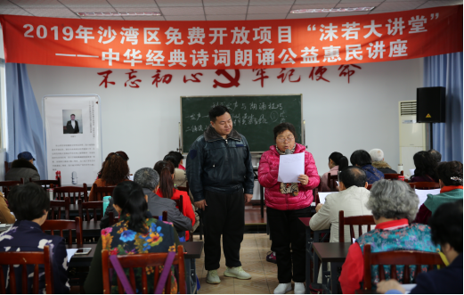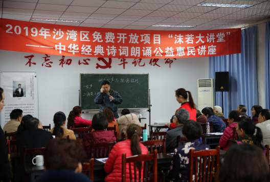 为更好地弘扬沫若文化,广泛开展群众经典诗文诵读,按照我馆年初工作安排计划。2019年3月22日,在沙湾区老年大学开展2019年“沫若大讲堂”中华经典诗词朗诵公益惠民讲座,此项目是我馆免费开放项目之一。